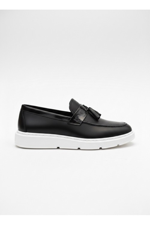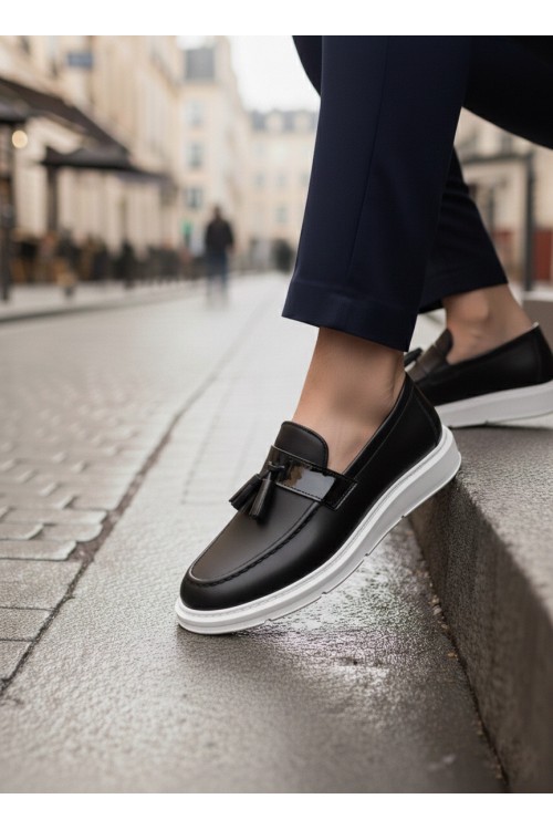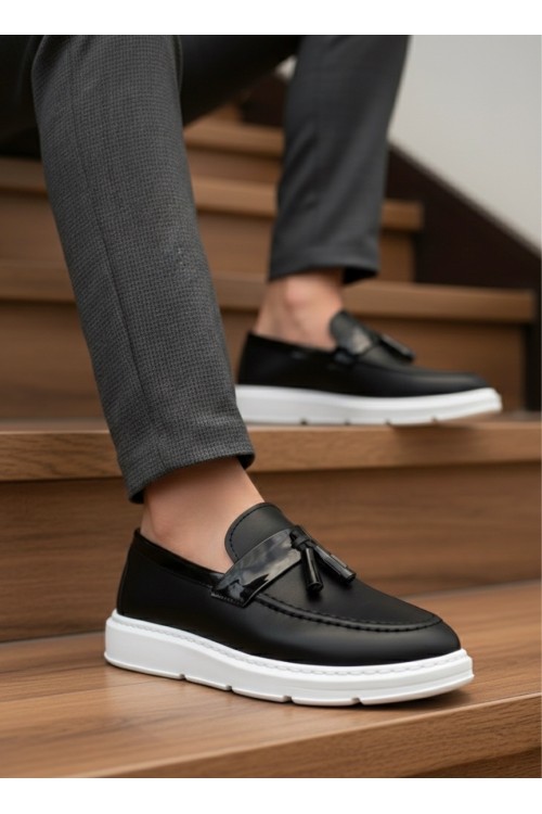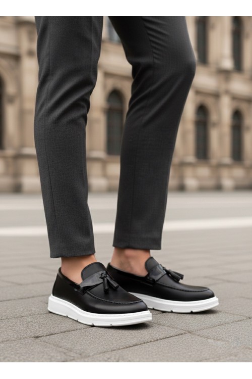BA0005 Bağcıksız Yüksek Taban Klasik Püsküllü Corcik Erkek Ayakkabı Siyah Beyaz
