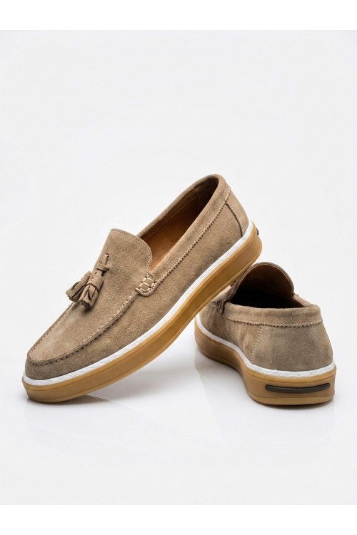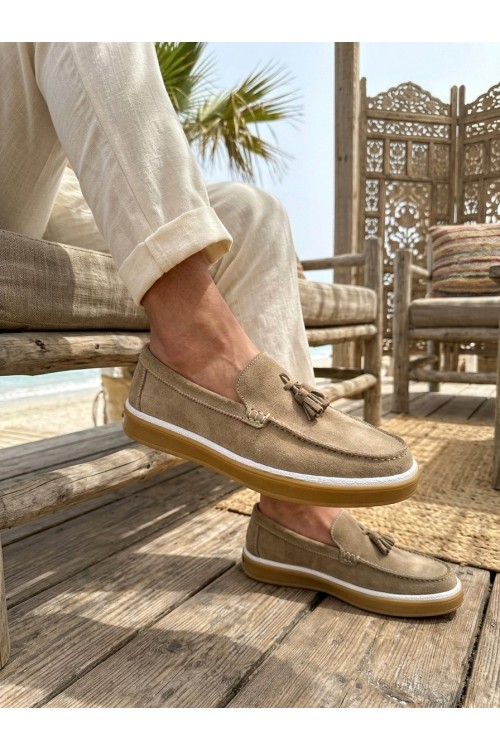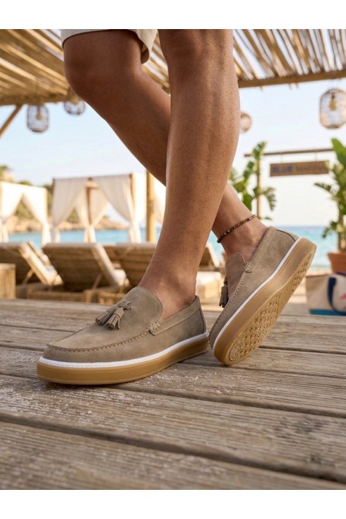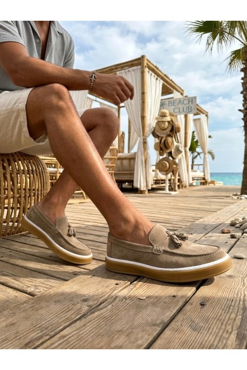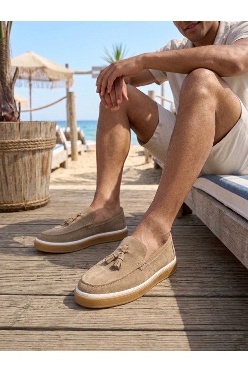 BA0250 %100 İçi Dışı Hakiki Deri Erkek Bej Süet Casual Loafer Püskül Detaylı Kauçuk Rahat Taban Dikişli Ayakkabı