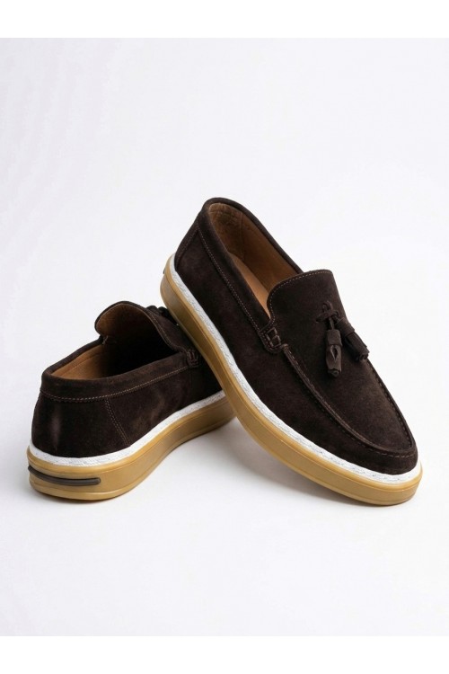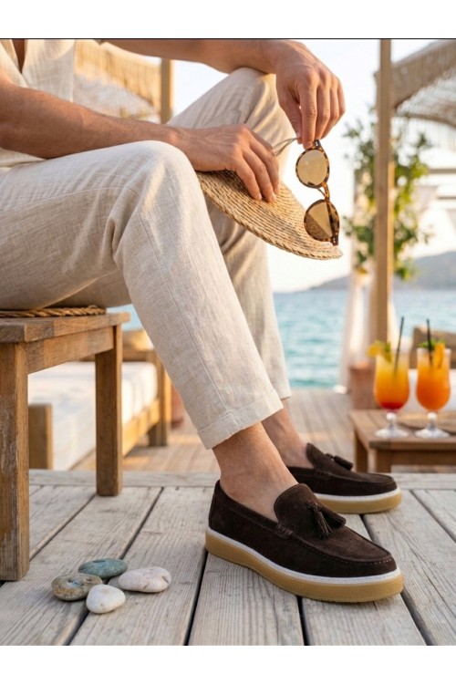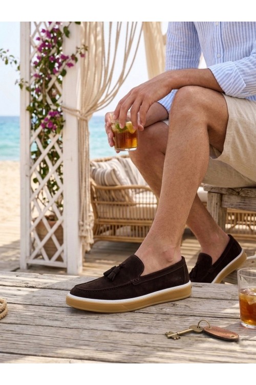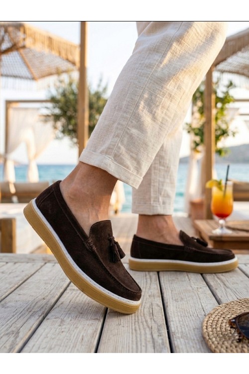 BA0250 %100 İçi Dışı Hakiki Deri Erkek Kahverengi Süet Casual Loafer Püskül Detaylı Kauçuk Rahat Taban Dikişli Ayakkabı
