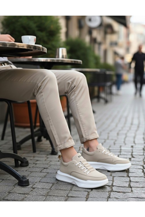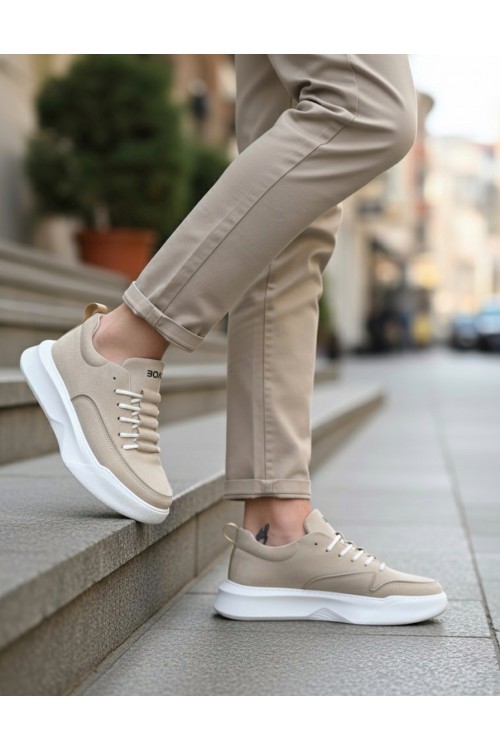BA0332 Merdiven Desen Bağcıklı Erkek Yüksek Taban Krem Süet Spor Ayakkabı